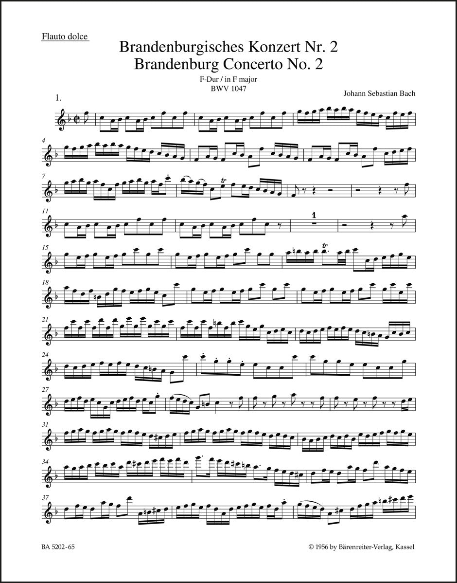 **Title**: Brandenburg Concerto no. 2 in F major BWV 1047 | **Composer / Author**: Bach, Johann Sebastian | **Editor**: Besseler, Heinrich | **Edition Type**: Wind set, Urtext edition | **Scoring/ Instrumentation**: Trumpet, Treble recorder, Oboe | **Binding**: Stapled | **Duration**: 00:11:00 | **Weight**: 79.0 g | **Format**: 32,5 x 25,5 cm | **Pages**: 5/8/4 S. | **Language**: EN | Sample: https://data.baerenreiter.com/NB/BA/BA05202_65_9790006501380_nb_lrg_01.jpg