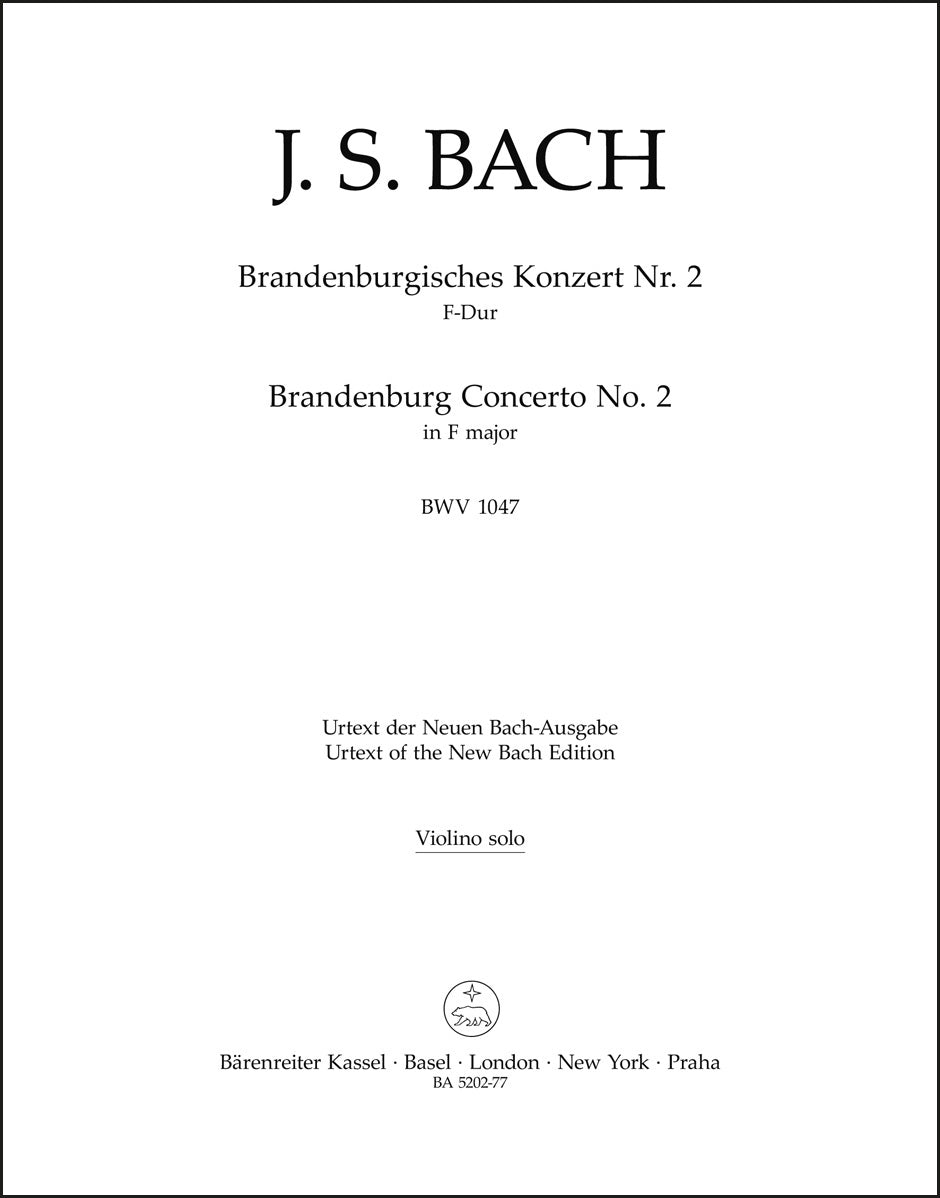 **Title**: Brandenburg Concerto no. 2 in F major BWV 1047 | **Composer / Author**: Bach, Johann Sebastian | **Editor**: Besseler, Heinrich | **Edition Type**: Part, Urtext edition | **Scoring/ Instrumentation**: Violin solo | **Binding**: Stapled | **Duration**: 00:11:00 | **Weight**: 33.0 g | **Format**: 32,5 x 25,5 cm | **Pages**: 8 S. | **Language**: EN | Sample: https://data.baerenreiter.com/NB/BA/BA05202_77_9790006501328_nb_lrg_01.jpg