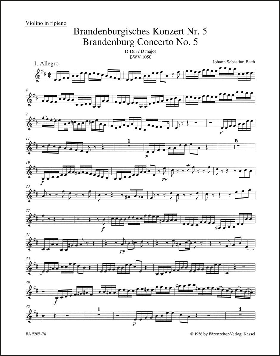**Title**: Brandenburg Concerto No. 5 BWV 1050 and Concerto No. 5 "Early Version" BWV 1050a in D major BWV 1050, 1050a | **Composer / Author**: Bach, Johann Sebastian | **Editor**: Besseler, Heinrich / Dürr, Alfred | **Edition Type**: Part, Urtext edition | **Scoring/ Instrumentation**: Violin | **Binding**: Stapled | **Duration**: 00:24:19 | **Weight**: 50.0 g | **Format**: 32,5 x 25,5 cm | **Pages**: 11 S. | **Language**: EN | Sample: https://data.baerenreiter.com/NB/BA/BA05205_74_9790006504954_nb_lrg_01.jpg