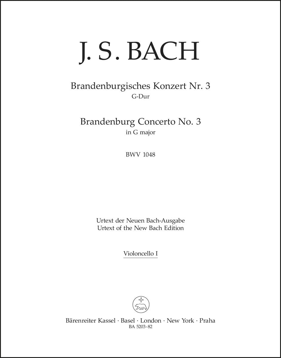 **Title**: Brandenburg Concerto no. 3 in G major BWV 1048 | **Composer / Author**: Bach, Johann Sebastian | **Editor**: Besseler, Heinrich | **Edition Type**: Part, Urtext edition | **Scoring/ Instrumentation**: 1. Violoncello | **Binding**: Stapled | **Weight**: 33.0 g | **Format**: 32,5 x 25,5 cm | **Pages**: 7 S. | **Language**: EN | Sample: https://data.baerenreiter.com/NB/BA/BA05203_82_9790006502202_nb_lrg_01.jpg