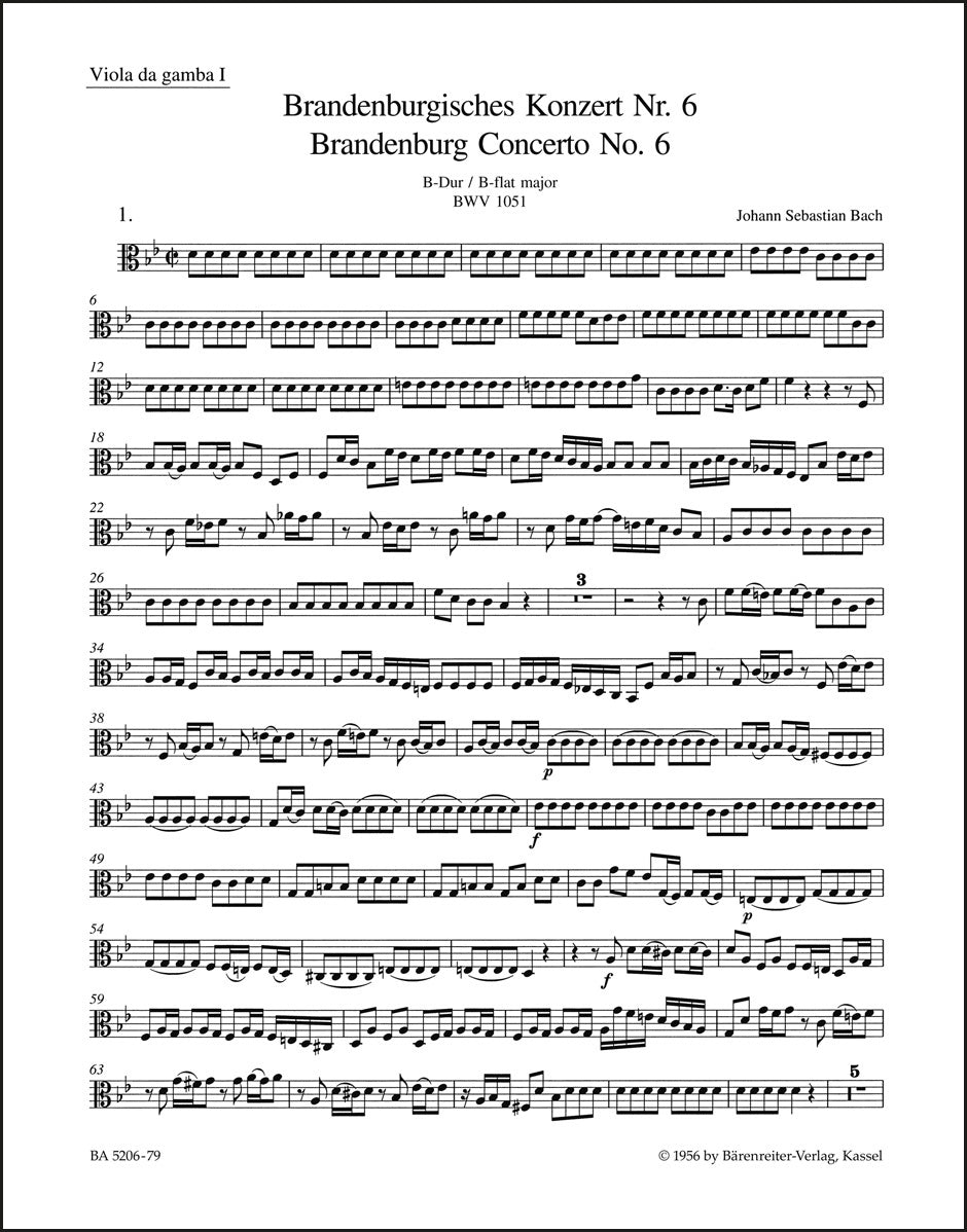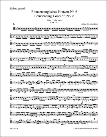 **Title**: Brandenburg Concerto no. 6 in B flat-major BWV 1051 | **Composer / Author**: Bach, Johann Sebastian | **Editor**: Besseler, Heinrich | **Edition Type**: Part, Urtext edition | **Scoring/ Instrumentation**: 1. Viola da gamba | **Binding**: Stapled | **Weight**: 16.0 g | **Format**: 32,5 x 25,5 cm | **Pages**: 4 S. | **Language**: EN | Sample: https://data.baerenreiter.com/NB/BA/BA05206_79_9790006505036_nb_lrg_01.jpg