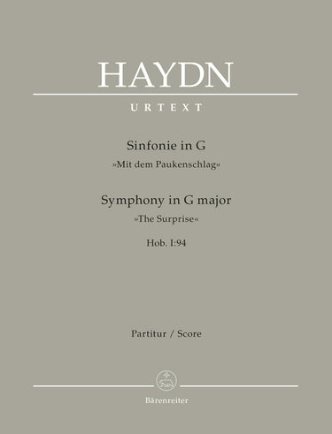 **Title**: Symphony in G major Hob. I:94 "The Surprise" | **Comments on Version**: Urtext from: Joseph Haydn Werke, G. Henle Verlag Munich | **Composer / Author**: Haydn, Joseph | **Editor**: Zahn, Robert von | **Preface**: Zahn, Robert von | **Edition Type**: Score, Urtext edition | **Instrumentation**: Orchestra | **Scoring/ Instrumentation**: Orchestra | **Binding**: Stapled | **Printing**: 5th printing 2019 | **Weight**: 286.0 g | **Format**: 31,0 x 24,3 cm | **Pages**: VI, 58 S. | **Language**: EN | Sample: https://data.baerenreiter.com/NB/BA/BA04680_00_9790006503940_nb_lrg_01.jpg