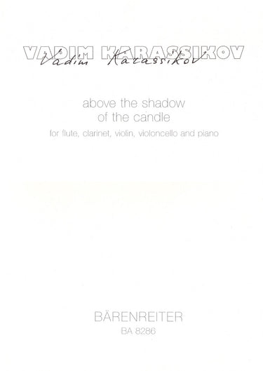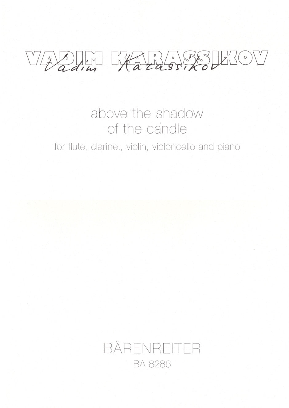**Title**: above the shadow of the candle für Flöte, Klarinette, Violine, Cello, Klavier (1999) | **Comments**: Uraufführung 20.12.2000, Wien | **Composer / Author**: Karassikov, Vadim | **Edition Type**: Score | **Scoring/ Instrumentation**: Flute, Clarinet, Violin, Violoncello, Piano | **Binding**: Stapled | **Duration**: 00:15:00 | **Weight**: 438.0 g | **Format**: 41,9 x 29,6 cm | **Pages**: 12/23 S. | **Language**: EN | Sample: https://data.baerenreiter.com/NB/BA/BA08286_00_9790006521296_nb_lrg_01.jpg