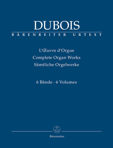 **Title**: Complete Organ Works, Volume I-VI | **Comments on Version**: Set consisting of 6 volumes | **Composer / Author**: Dubois, Théodore | **Editor**: Schauerte-Maubouet, Helga | **Preface**: Schauerte-Maubouet, Helga | **Edition Type**: Performance score, Anthology, Urtext edition | **Instrumentation**: Organ | **Scoring/ Instrumentation**: Organ | **Binding**: Paperback | **Weight**: 2661.0 g | **Format**: 30,2 x 23,1 cm | **Pages**: 734 S. | **Language**: EN | Sample: https://data.baerenreiter.com/NB/BA/BA09220_00_9790006537785_nb_lrg_01.jpg
