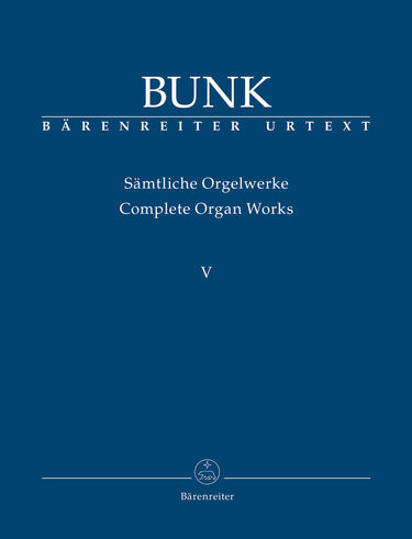 **Title**: Complete Organ Works, Volume V | **Composer / Author**: Bunk, Gerard | **Editor**: Boecker, Jan | **Preface**: Boecker, Jan | **Edition Type**: Performance score, Anthology, Urtext edition | **Instrumentation**: Organ | **Scoring/ Instrumentation**: Organ | **Binding**: Paperback | **Level of Difficulty**: 4.0 | **Printing**: 1st printing 2013 | **Weight**: 400.0 g | **Format**: 29,9 x 22,9 cm | **Pages**: XXII, 79 S. | **Language**: EN | Sample: https://data.baerenreiter.com/NB/BA/BA09285_00_9790006537198_nb_lrg_01.jpg