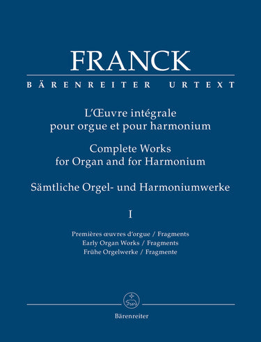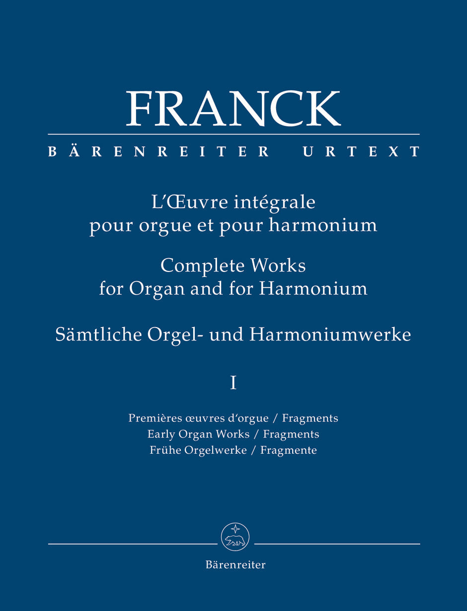 **Title**: Early Organ Works / Fragments | **Composer / Author**: Franck, César | **Editor**: Strucken-Paland, Christiane | **Edition Type**: Performance score, Anthology, Urtext edition | **Instrumentation**: Organ | **Scoring/ Instrumentation**: Organ | **Binding**: Paperback | **Level of Difficulty**: 4.0 | **Printing**: 1st printing 2018 | **Weight**: 507.0 g | **Format**: 30,0 x 23,0 cm | **Pages**: LV, 80 S. | **Language**: EN | Sample: https://data.baerenreiter.com/NB/BA/BA09291_00_9790006538997_nb_lrg_01.jpg