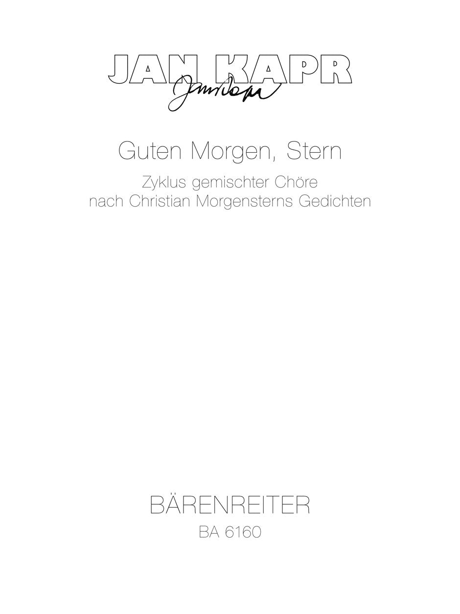 **Title**: Guten Morgen, Stern (1973) | **Subtitle**: Cycle for mixed choirs on poems after Christian Morgenstern | **Composer / Author**: Kapr, Jan | **Libretto/Text by**: Morgenstern, Christian | **Edition Type**: Choral score | **Instrumentation**: Choir | **Scoring/ Instrumentation**: Mixed choir (SSAATTBB) | **Binding**: Stapled | **Weight**: 298.0 g | **Format**: 32,1 x 24,1 cm | **Pages**: 71 S. | **Language**: EN | Sample: https://data.baerenreiter.com/NB/BA/BA06160_00_9790006476268_nb_lrg_01.jpg