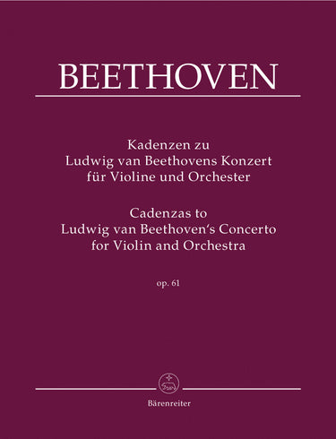 **Title**: Cadenzas to Beethoven's Violin Concerto for Violin and Orchestra op. 61 | **Comments**: For score, performance material and piano reduction see BA 9019 | **Composer / Author**: Beethoven, Ludwig van | **Editor**: Wulfhorst, Martin | **Edition Type**: Performance score, Anthology | **Instrumentation**: Violin, Orchestra | **Scoring/ Instrumentation**: Violin solo | **Binding**: Stapled | **Printing**: 4th printing 2023 | **Weight**: 319.0 g | **Format**: 31,0 x 24,3 cm | **Pages**: XI, 59 S. | **Language**: EN | Sample: https://data.baerenreiter.com/NB/BA/BA09020_00_9790006538607_nb_lrg_01.jpg