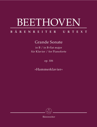 **Title**: Grande Sonate for Pianoforte in B-flat major op. 106 "Hammerklavier" | **Comments on Version**: With notes on performance practice by Jonathan Del Mar and Misha Donat | **Composer / Author**: Beethoven, Ludwig van | **Editor**: Del Mar, Jonathan | **Edition Type**: Performance score, Urtext edition | **Instrumentation**: Piano | **Scoring/ Instrumentation**: Piano | **Binding**: Paperback | **Level of Difficulty**: 6.0 | **Printing**: 1st printing 2019 | **Weight**: 385.0 g | **Format**: 31,0 x 24,3 cm | **Pages**: XX, 72 S. | **Language**: EN | Sample: https://data.baerenreiter.com/NB/BA/BA11810_00_9790006561834_nb_lrg_01.jpg