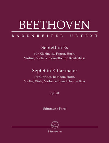 **Title**: Septet for Clarinet, Bassoon, Horn, Violin, Viola, Violoncello and Double Bass in E-flat major op. 20 | **Composer / Author**: Beethoven, Ludwig van | **Editor**: Del Mar, Jonathan | **Edition Type**: Set of parts, Urtext edition | **Scoring/ Instrumentation**: Clarinet, Horn, Bassoon, Violin, Viola, Violoncello, Double bass | **Binding**: in a folder | **Printing**: 1st printing 2023 | **Weight**: 360.0 g | **Format**: 31,0 x 24,3 cm | **Pages**: 10/10/8/15/12/12/10 S. | **Language**: EN | Sample: https://data.baerenreiter.com/NB/BA/BA10944_00_9790006574773_nb_lrg_01.jpg