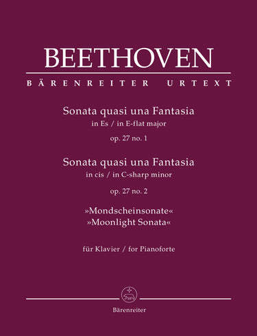 **Title**: Sonata quasi una Fantasia for Pianoforte in E-flat major 27/1 / Sonata quasi una Fantasia for Pianoforte in C-sharp minor 27/1 "Moonlight Sonata" | **Composer / Author**: Beethoven, Ludwig van | **Editor**: Del Mar, Jonathan | **Edition Type**: Performance score, Anthology, Urtext edition | **Instrumentation**: Piano | **Scoring/ Instrumentation**: Piano | **Binding**: Stapled | **Level of Difficulty**: 5.0 | **Printing**: 2nd printing 2019 | **Weight**: 303.0 g | **Format**: 31,0 x 24,3 cm | **Pages**: XIX, 49 S. | **Language**: EN | Sample: https://data.baerenreiter.com/NB/BA/BA10853_00_9790006557998_nb_lrg_01.jpg