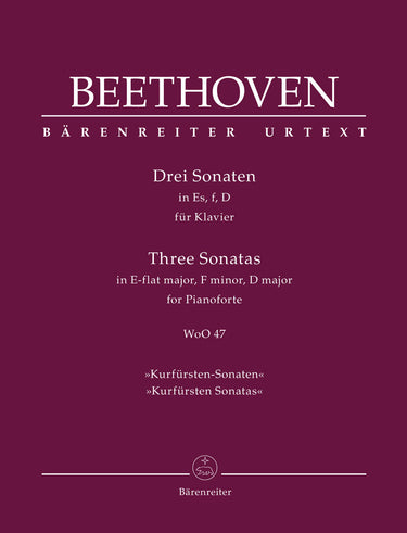 **Title**: Three Sonatas for Pianoforte in E-flat major, F minor, D major WoO 47 "Kurfürsten Sonatas" | **Comments on Version**: With notes on performance practice by Jonathan Del Mar and Misha Donat | **Composer / Author**: Beethoven, Ludwig van | **Editor**: Del Mar, Jonathan | **Edition Type**: Performance score, Anthology, Urtext edition | **Instrumentation**: Piano | **Scoring/ Instrumentation**: Piano | **Binding**: Paperback | **Level of Difficulty**: 3.0 | **Printing**: 1st printing 2018 | **Weight**: 280.0 g | **Format**: 31,0 x 24,3 cm | **Pages**: XI, 54 S. | **Language**: EN | Sample: https://data.baerenreiter.com/NB/BA/BA11801_00_9790006561742_nb_lrg_01.jpg