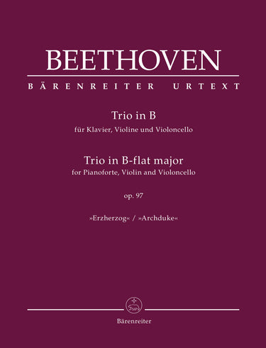 **Title**: Trio for Pianoforte, Violin and Violoncello op. 97 | **Subtitle**: Archduke | **Composer / Author**: Beethoven, Ludwig van | **Editor**: Del Mar, Jonathan | **Preface**: Donat, Misha | **Edition Type**: Score, Part, Urtext edition | **Instrumentation**: Piano, Violin, Violoncello | **Scoring/ Instrumentation**: Piano, Violin, Violoncello | **Binding**: Hardback | **Printing**: 1st printing 2022 | **Weight**: 491.0 g | **Format**: 31,0 x 24,3 cm | **Pages**: XII, 88/15/17 S. | **Language**: EN | Sample: https://data.baerenreiter.com/NB/BA/BA10942_00_9790006569977_nb_lrg_01.jpg