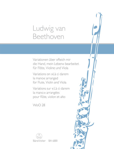**Title**: Variationen über "Reich mir die Hand, mein Leben" WoO 28 | **Subtitle**: Bearbeitung für 3 Instrumente | **Misc Information**: aus Mozarts "Don Giovanni" | **Composer / Author**: Beethoven, Ludwig van | **Editor**: Riedel, Hans-Wolfgang | **Edition Type**: Score, Set of parts | **Scoring/ Instrumentation**: Flute, Violin, Viola | **Binding**: Stapled | **Level of Difficulty**: 3.0 | **Printing**: 4. Aufl. 2023 | **Weight**: 145.0 g | **Format**: 30,0 x 23,0 cm | **Pages**: 15/7/7 S. | **Language**: EN | Sample: https://data.baerenreiter.com/NB/BA/BA06881_00_9790006483372_nb_lrg_01.jpg