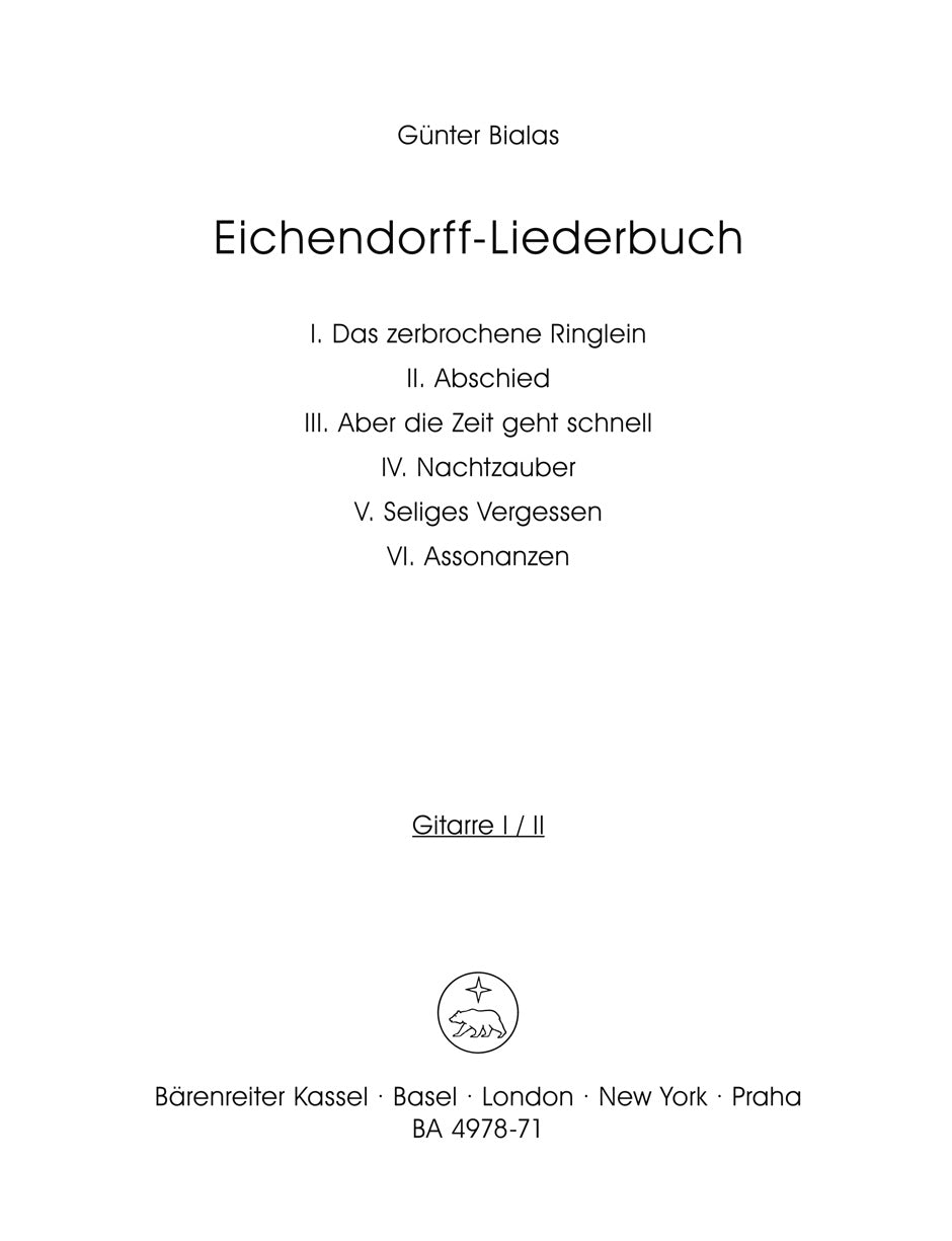 **Title**: Eichendorff-Liederbuch (1965) | **Composer / Author**: Bialas, Günter | **Libretto/Text by**: Eichendorff, Joseph von | **Edition Type**: Part | **Scoring/ Instrumentation**: 1. Guitar, 2. Guitar | **Binding**: Stapled | **Weight**: 54.0 g | **Format**: 31,0 x 23,0 cm | **Pages**: 15 S. | **Language**: EN | Sample: https://data.baerenreiter.com/NB/BA/BA04978_71_9790006461080_nb_lrg_01.jpg