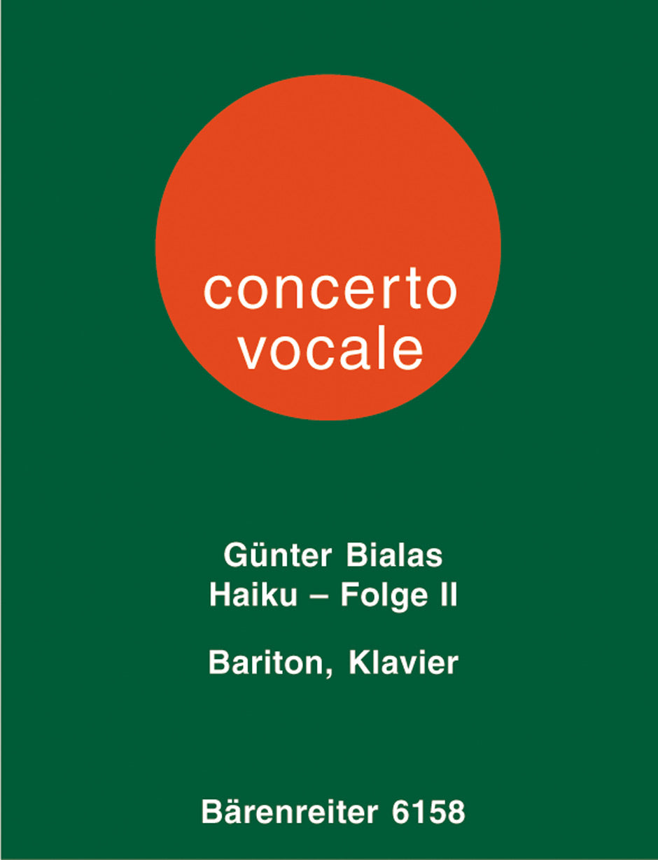 **Title**: Haiku – Folge 2 for Baritone and Piano (1972) | **Subtitle**: 12 texts by various Japanese Haiku poets of the 18th and 19th century | **Composer / Author**: Bialas, Günter | **Edition Type**: Singing Score, Performance score | **Instrumentation**: Baritone, Piano | **Scoring/ Instrumentation**: Baritone solo, Piano | **Binding**: Stapled | **Weight**: 100.0 g | **Format**: 30,0 x 23,0 cm | **Pages**: 11 S. | **Language**: EN | Sample: https://data.baerenreiter.com/NB/BA/BA06158_00_9790006476244_nb_lrg_01.jpg