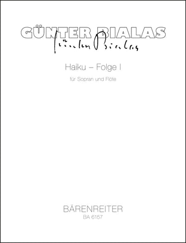 **Title**: Haiku – Folge I for Soprano and Flute (1972) | **Subtitle**: 8 texts by various Japanese Haiku poets of the 18th and 19th century | **Composer / Author**: Bialas, Günter | **Edition Type**: Singing Scores (2), Performance scores (2) | **Scoring/ Instrumentation**: Soprano solo, Flute | **Binding**: Stapled | **Language of Text Part**: German | **Weight**: 86.0 g | **Format**: 30,0 x 23,0 cm | **Pages**: 8/8 S. | **Language**: EN | Sample: https://data.baerenreiter.com/NB/BA/BA06157_00_9790006476237_nb_lrg_01.jpg
