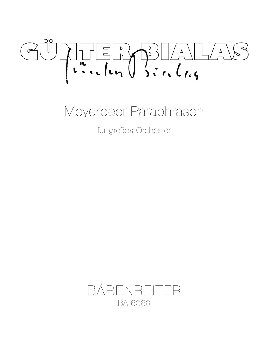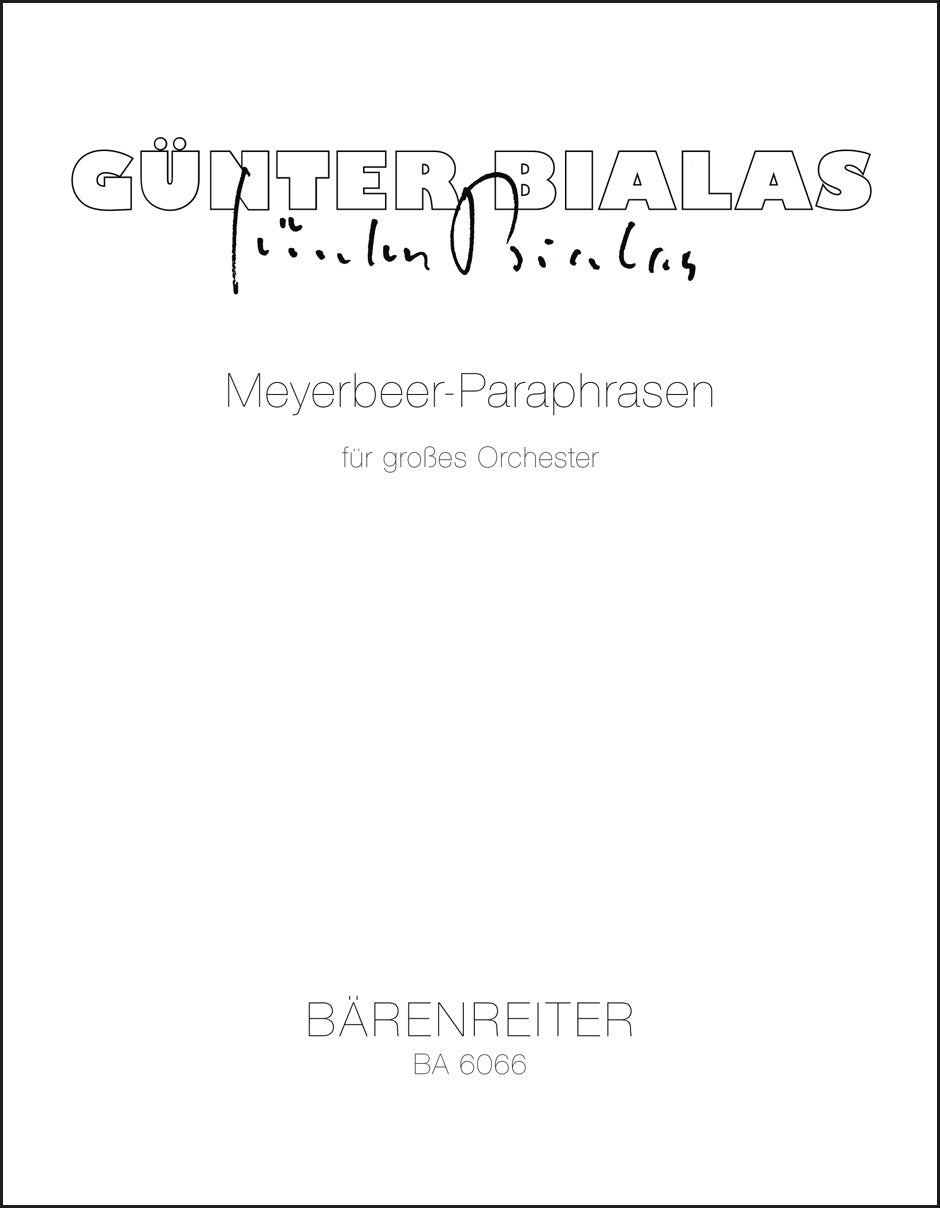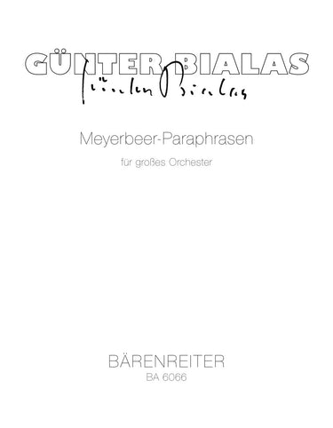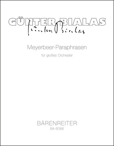 **Title**: Meyerbeer-Paraphrasen for Large Orchestra (1971) | **Comments on Version**: Orchestral version and ballet version. The ballet version includes an additional piano solo which is not included in the orchestral verion | **Composer / Author**: Bialas, Günter | **Edition Type**: Study score | **Instrumentation**: Orchestra | **Binding**: Paperback | **Duration**: 00:23:00 | **Weight**: 286.0 g | **Format**: 27,0 x 20,6 cm | **Pages**: 102 S. | **Language**: EN | Sample: https://data.baerenreiter.com/NB/BA/BA06066_00_9790006475230_nb_lrg_01.jpg