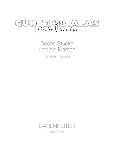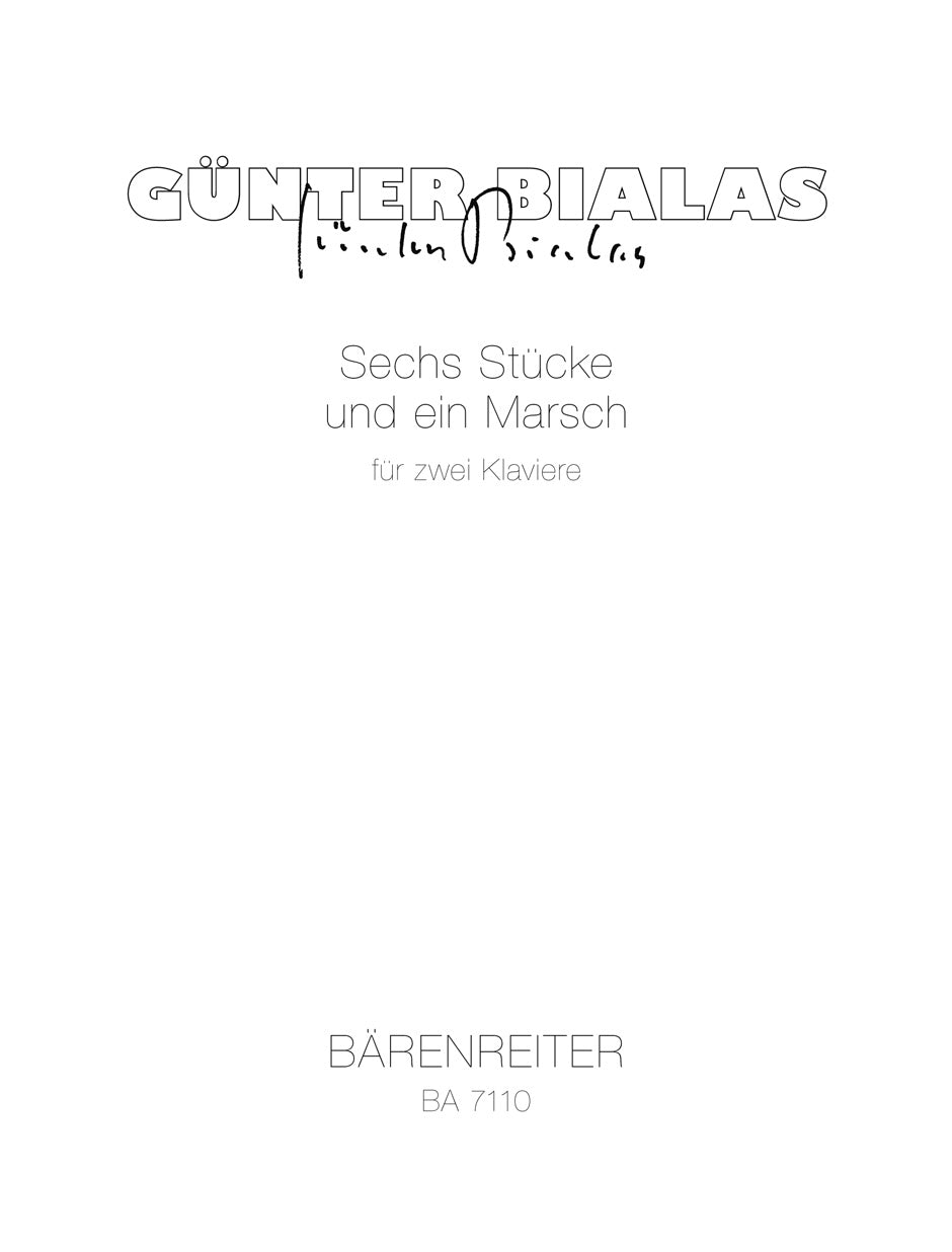 **Title**: Sechs Stücke und ein Marsch (1987) | **Composer / Author**: Bialas, Günter | **Edition Type**: Performance score | **Instrumentation**: Piano | **Scoring/ Instrumentation**: Pianos (2) | **Binding**: Stapled | **Weight**: 238.0 g | **Format**: 35,6 x 27,2 cm | **Pages**: 37 S. | **Language**: EN | Sample: https://data.baerenreiter.com/NB/BA/BA07110_00_9790006485444_nb_lrg_01.jpg