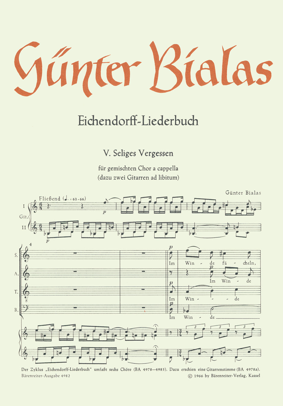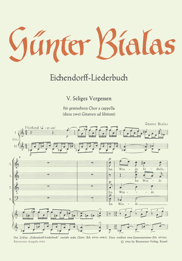 **Title**: Seliges Vergessen for Mixed Choir a cappella no. 5 | **Misc Information**: from the "Eichendorff-Liederbuch" (1965) | **Composer / Author**: Bialas, Günter | **Libretto/Text by**: Eichendorff, Joseph von | **Edition Type**: Choral score | **Scoring/ Instrumentation**: Mixed choir (SATB), Guitars (2), Piano, Harpsichord ad libitum | **Binding**: Folded | **Language of Text Part**: German | **Weight**: 14.0 g | **Format**: 27,0 x 19,0 cm | **Pages**: 6 S. | **Language**: EN | Sample: https://data.baerenreiter.com/NB/BA/BA04982_00_9790006461127_nb_lrg_01.jpg