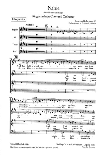 Nänie Op. 82 | “Even beauty must die” – Urtext based on the Brahms Complete Edition of the Gesellschaft der Musikfreunde in Vienna | mix ch,orch | choir: SATB – 2.2.2.2 – 2.0.3.0 – timp – hp – str | Choir | Chorus | Chorus a cappella | 15' | Romantic | Cantata | Sheet Music | choral score | | | 16 | stapled | 19 x 27 cm