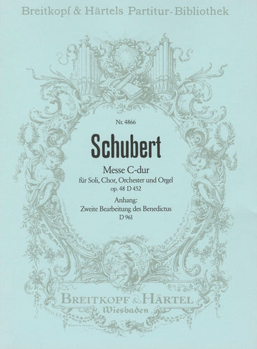 Mass in C major D 452 [Op. 48] | with a 2nd Benedictus D 961 | solos,mix ch,orch | solos: SATB – choir: SATB – 0.2ob or 2clar.0 – 0.2.0.0 – timp – org – str(without va) (wind parts ad lib) | Choir | Chorus | Chorus (with soloists) and orchestra | 25' | Romantic | Mass | Sheet Music | full score | | | 44 | Softcover | 23 x 30,5 cm