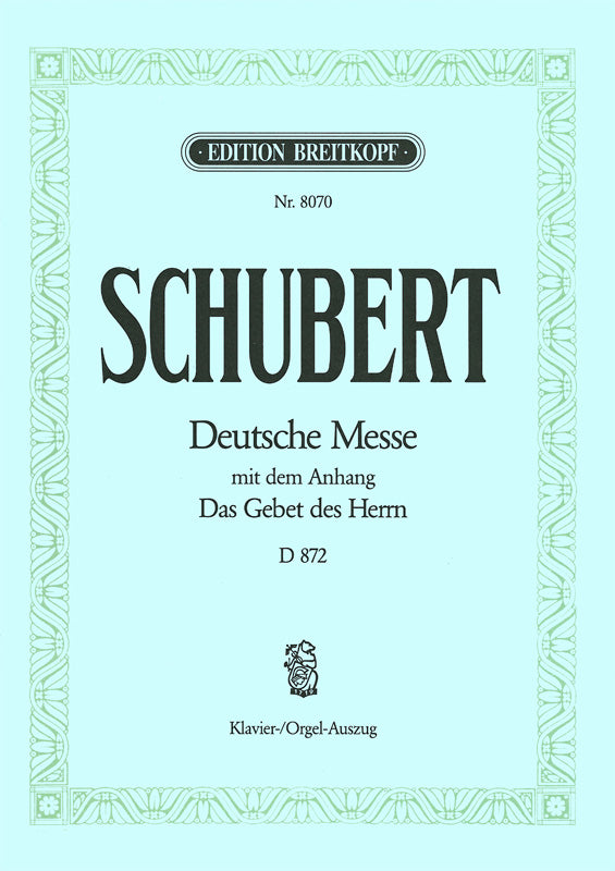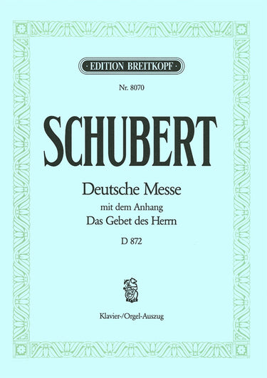 Deutsche Messe in F major D 872 | with the Appendix “Das Gebet des Herrn” | mix ch,orch | choir: SATB – 0.2.2.2 – 2.2.3.0 – timp – org – db ad lib. | Choir | Chorus | Chorus (with soloists) and orchestra | 32' | Romantic | Mass | Sheet Music | full score | | | 20 | stapled | 23 x 30,5 cm