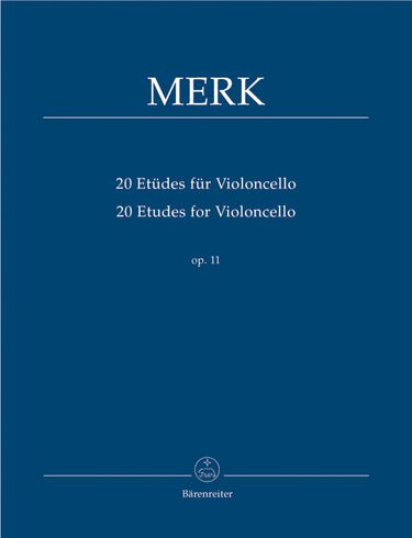 **Title**: 20 Etudes for Violoncello op. 11 | **Composer / Author**: Merk, Joseph | **Editor**: Rummel, Martin | **Preface**: Rummel, Martin | **Edition Type**: Performance score | **Instrumentation**: Violoncello | **Scoring/ Instrumentation**: Violoncello | **Binding**: Stapled | **Printing**: 2nd printing 2023 | **Weight**: 218.0 g | **Format**: 31,0 x 24,3 cm | **Pages**: III, 39 S. | **Language**: EN | Sample: https://data.baerenreiter.com/NB/BA/BA09411_00_9790006534951_nb_lrg_01.jpg