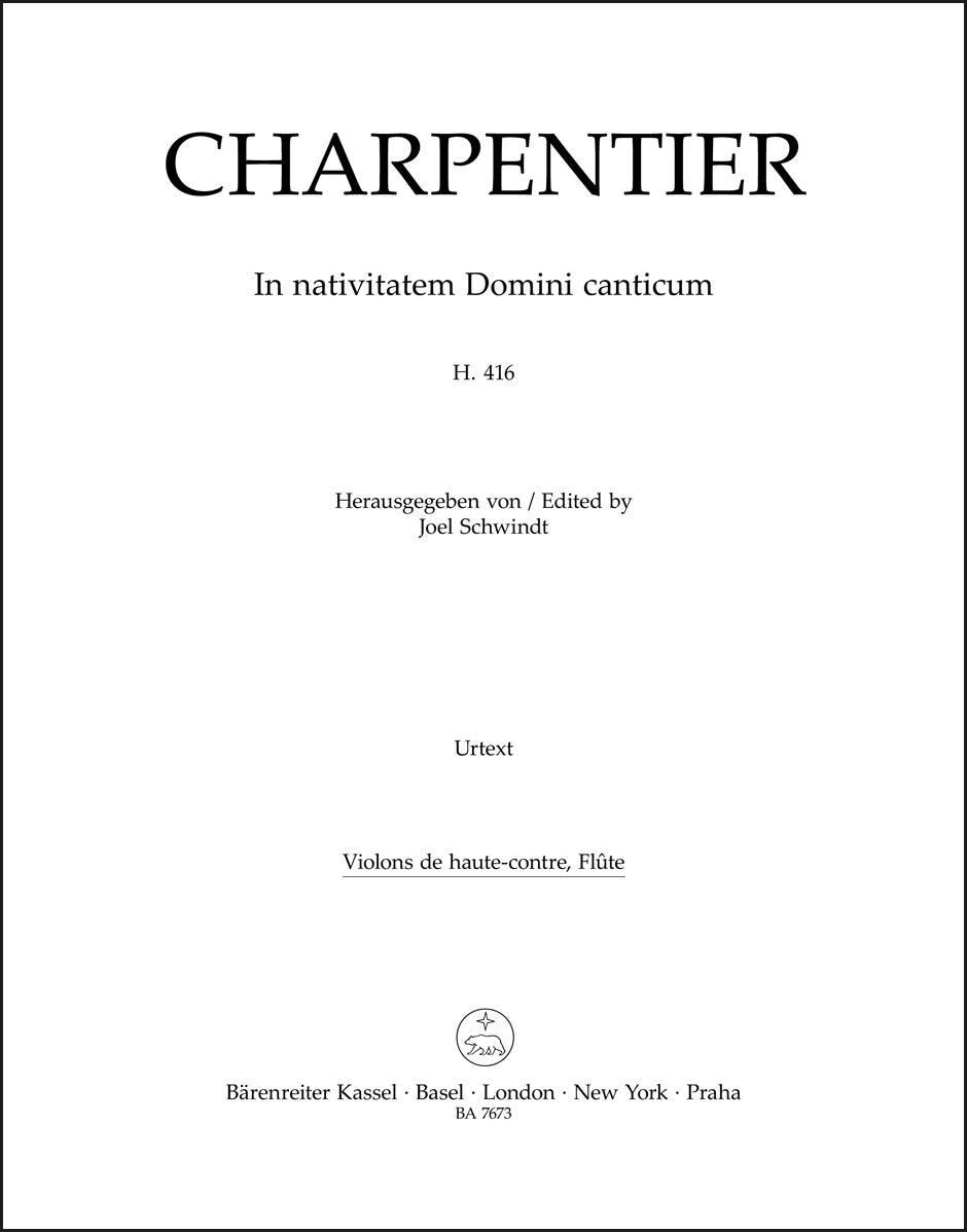 **Title**: In nativitatem Domini canticum H. 416 | **Composer / Author**: Charpentier, Marc-Antoine | **Editor**: Schwindt, Joel | **Edition Type**: Part, Urtext edition | **Scoring/ Instrumentation**: 2. Violin, 2. Flute | **Binding**: Stapled | **Weight**: 50.0 g | **Format**: 32,5 x 25,5 cm | **Pages**: 11 S. | **Language**: EN | Sample: https://data.baerenreiter.com/NB/BA/BA07673_75_9790006540020_nb_lrg_01.jpg