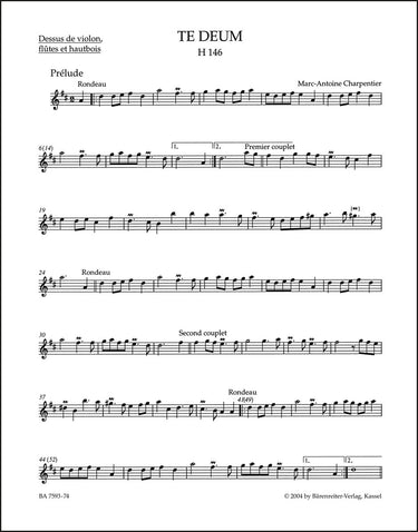 **Title**: Te Deum in D major H 146 | **Composer / Author**: Charpentier, Marc-Antoine | **Editor**: Schauerte-Maubouet, Helga | **Edition Type**: Part, Urtext edition | **Scoring/ Instrumentation**: 1. Violin, 1. Flute, 2. Flute, 1. Oboe, 2. Oboe | **Binding**: Stapled | **Weight**: 49.0 g | **Format**: 32,5 x 25,5 cm | **Pages**: 11 S. | **Language**: EN | Sample: https://data.baerenreiter.com/NB/BA/BA07593_74_9790006525393_nb_lrg_01.jpg