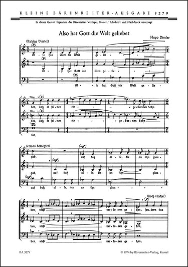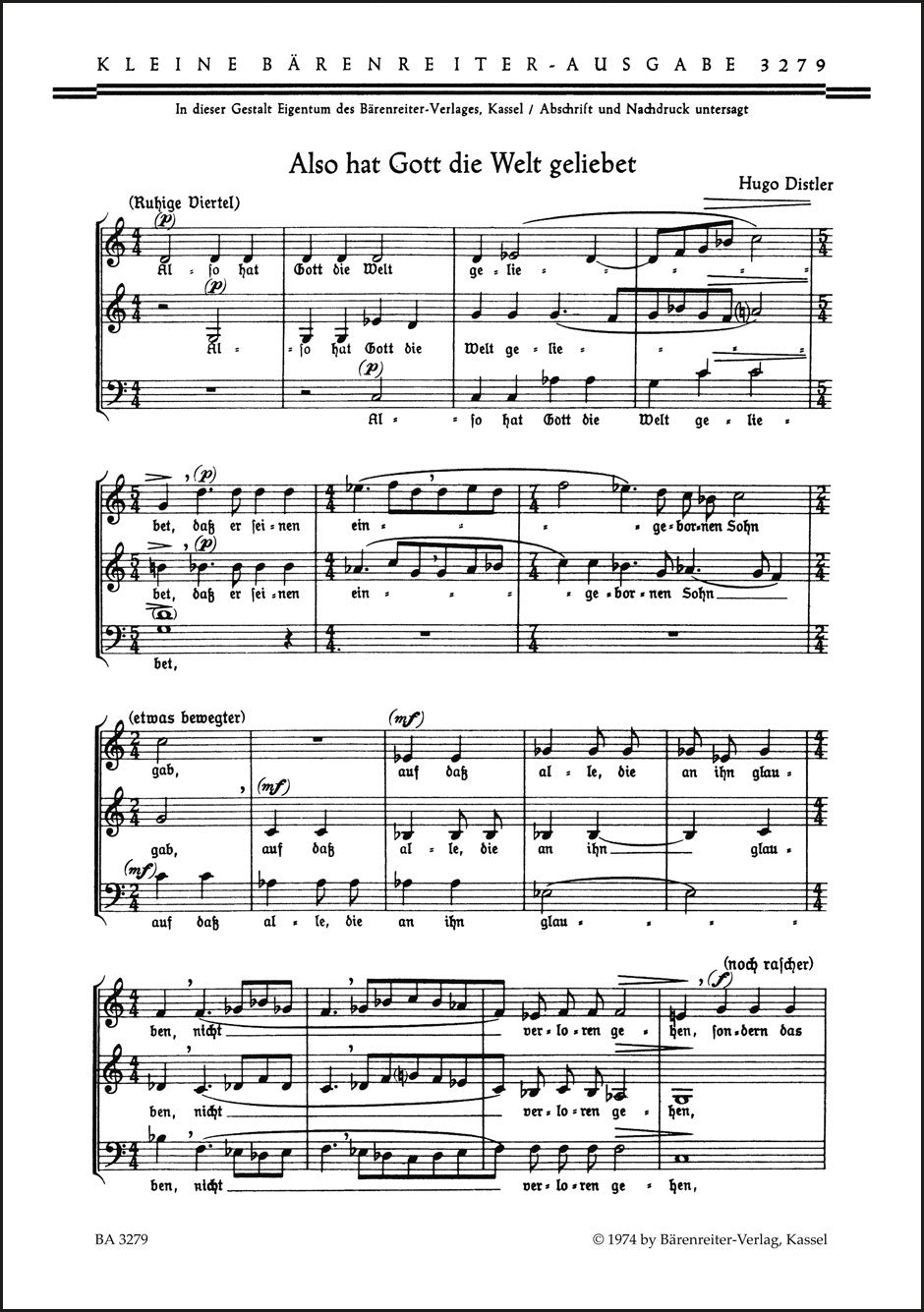 **Title**: Also hat Gott die Welt geliebet no. 16 | **Subtitle**: Kleine Motette | **Misc Information**: Liedsatz aus "Der Jahrkreis" op. 5 (1932/33) | **Composer / Author**: Distler, Hugo | **Edition Type**: Choral score | **Instrumentation**: Choir | **Scoring/ Instrumentation**: Mixed choir: SAMSt | **Binding**: Single sheet | **Level of Difficulty**: 3.0 | **Printing**: 8. Aufl. 2014 | **Weight**: 5.0 g | **Format**: 27,0 x 19,0 cm | **Pages**: 2 S. | **Language**: EN | Sample: https://data.baerenreiter.com/NB/BA/BA03279_00_9790006432301_nb_lrg_01.jpg