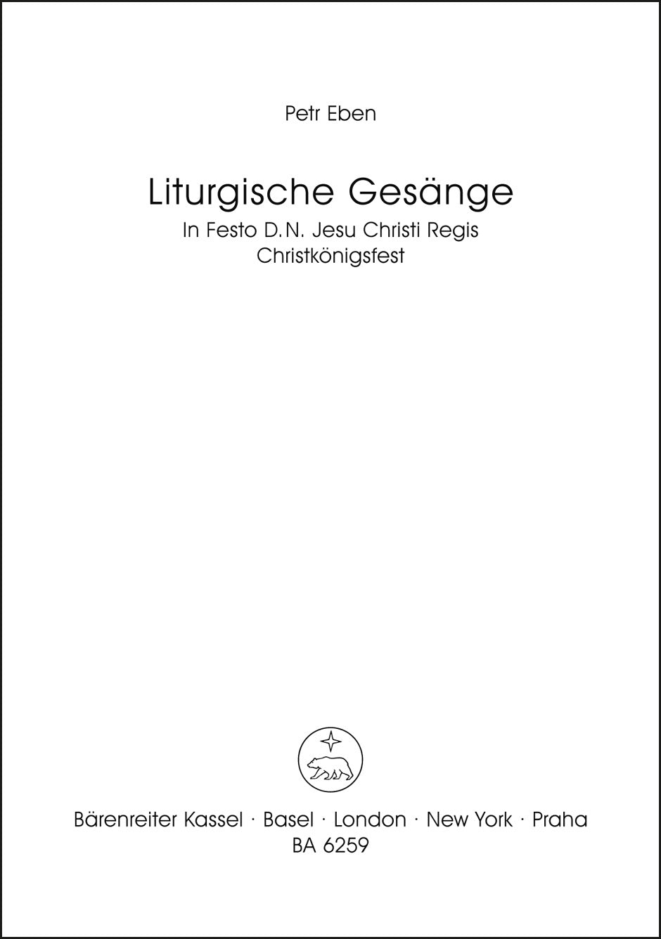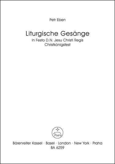 **Title**: In Festo D.N. Jesu Christi Regis - Proprium zum Christkönigsfest Dignus est Agnus / Würdig ist das Lamm | **Subtitle**: Liturgische Gesänge 9. Einstimmiger Chor (auch im Wechsel mit Solostimmen) und Orgel (lateinisch / deutsch) | **Composer / Author**: Eben, Petr | **Edition Type**: Choral score | **Instrumentation**: Choir, Organ | **Scoring/ Instrumentation**: Choir, Organ | **Binding**: Stapled | **Level of Difficulty**: 3.0 | **Language of Text Part**: Latin, German | **Weight**: 19.0 g | **Format**: 27,0 x 19,1 cm | **Pages**: 6 S. | **Language**: EN | Sample: https://data.baerenreiter.com/NB/BA/BA06259_00_9790006477593_nb_lrg_01.jpg