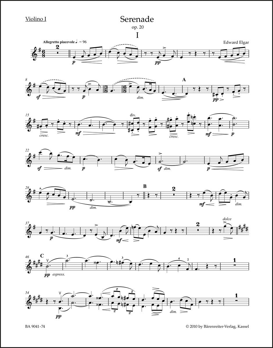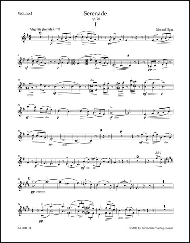 **Title**: Serenade for Strings op. 20 | **Composer / Author**: Elgar, Edward | **Editor**: Hogwood, Christopher | **Edition Type**: Part, Urtext edition | **Scoring/ Instrumentation**: 1. Violin | **Binding**: Stapled | **Duration**: 00:12:00 | **Weight**: 33.0 g | **Format**: 32,5 x 25,5 cm | **Pages**: 6 S. | **Language**: EN | Sample: https://data.baerenreiter.com/NB/BA/BA09041_74_9790006527717_nb_lrg_01.jpg