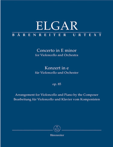**Title**: Concerto for Violoncello and Orchestra in E minor op. 85 | **Comments on Version**: Arrangement for Violoncello and Piano by the Composer | **Composer / Author**: Elgar, Edward | **Arranger**: Elgar, Edward | **Editor**: Del Mar, Jonathan | **Edition Type**: Piano reduction, Part, Urtext edition | **Instrumentation**: Violoncello, Orchestra | **Scoring/ Instrumentation**: Violoncello, Piano | **Binding**: Stapled | **Duration**: 00:25:00 | **Printing**: 8th printing 2023 | **Weight**: 236.0 g | **Format**: 31,0 x 24,3 cm | **Pages**: 32/15 S. | **Language**: EN | Sample: https://data.baerenreiter.com/NB/BA/BA09040_90_9790006526949_nb_lrg_01.jpg