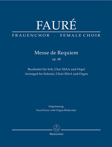 **Title**: Messe de Requiem op. 48 | **Arranged for**: Arranged for Soloists, Choir SSAA and Organ | **Composer / Author**: Fauré, Gabriel | **Arranger**: Bruno, Malcolm / Bredenbach, Ingo | **Preface**: Bruno, Malcolm | **Edition Type**: Organ reduction | **Scoring/ Instrumentation**: Soprano solo, Alto solo, Female choir (SSAA), Organ | **Binding**: Stapled | **Level of Difficulty**: 3.0 | **Printing**: 2nd printing 2024 | **Language of Text Part**: Latin | **Weight**: 162.0 g | **Format**: 27,0 x 19,0 cm | **Pages**: IV, 45 S. | **Language**: EN | Sample: https://data.baerenreiter.com/NB/BA/BA05695_90_9790006563487_nb_lrg_01.jpg
