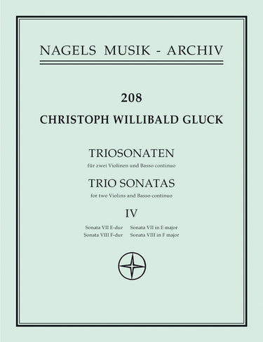 **Title**: Triosonaten für zwei Violinen und Basso continuo IV | **Composer / Author**: Gluck, Christoph Willibald | **Editor**: Croll, Gerhard / Neumann, Friedrich-Heinrich | **Edition Type**: Performance score, Set of parts, Urtext edition, Anthology | **Instrumentation**: Violin, Basso continuo | **Scoring/ Instrumentation**: Violins (2), Basso continuo | **Binding**: Stapled | **Level of Difficulty**: 3.0 | **Weight**: 246.0 g | **Format**: 30,0 x 23,0 cm | **Pages**: 24/9/11/11 S. | **Language**: EN | Sample: https://data.baerenreiter.com/NB/NMA/NMA00208_00_9790006010707_nb_lrg_01.jpg
