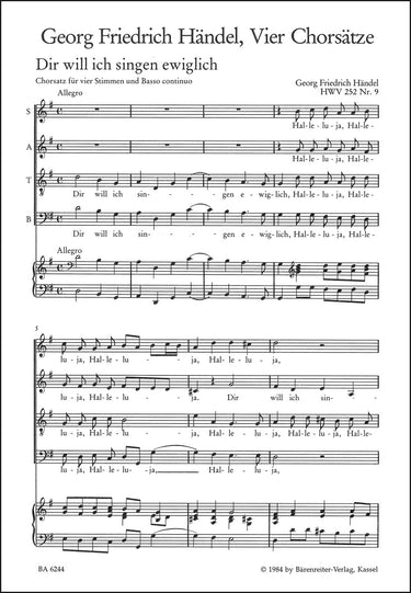 **Title**: Vier Chorsätze | **Composer / Author**: Handel, George Frideric | **Editor**: Landesverband der evangelischen Kirchenchöre in Baden | **Edition Type**: Choral score, Anthology | **Instrumentation**: Choir | **Scoring/ Instrumentation**: Mixed choir (SATB) | **Binding**: Stapled | **Level of Difficulty**: 2.0 | **Printing**: 10th printing 2023 | **Weight**: 20.0 g | **Format**: 27,0 x 19,0 cm | **Pages**: 8 S. | **Language**: EN | Sample: https://data.baerenreiter.com/NB/BA/BA06244_00_9790006477425_nb_lrg_01.jpg