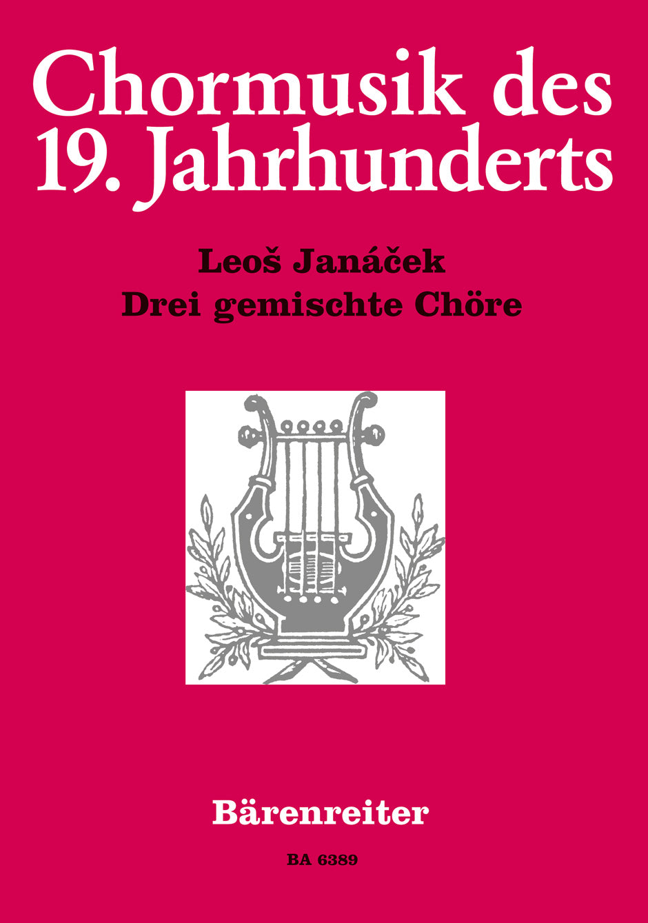 **Title**: Three pieces for mixed choir | **Comments on Version**: Divided parts in some sections | **Composer / Author**: Janácek, Leoš | **Editor**: Trojan, Jan | **Edition Type**: Choral score, Anthology | **Instrumentation**: Choir | **Scoring/ Instrumentation**: Mixed choir (SATB) | **Binding**: Stapled | **Level of Difficulty**: 4.0 | **Printing**: 5th printing 2009 | **Language of Text Part**: Czech, German | **Weight**: 111.0 g | **Format**: 27,0 x 19,0 cm | **Pages**: 40 S. | **Language**: EN | Sample: https://data.baerenreiter.com/NB/BA/BA06389_00_9790006479016_nb_lrg_01.jpg