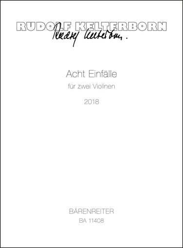 **Title**: Acht Einfälle for two Violins (2018) | **Composer / Author**: Kelterborn, Rudolf | **Edition Type**: Performance scores (2) | **Scoring/ Instrumentation**: Violins (2) | **Binding**: in a folder | **Level of Difficulty**: 4.0 | **Duration**: 00:07:00 | **Printing**: 2nd printing 2019 | **Weight**: 189.0 g | **Format**: 34,1 x 25,3 cm | **Pages**: 9/9 S. | **Language**: EN | Sample: https://data.baerenreiter.com/NB/BA/BA11408_00_9790006566860_nb_lrg_01.jpg