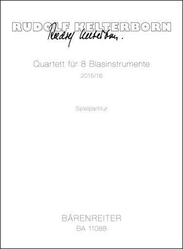 **Title**: Quartet for 8 Wind Instruments (2015/2016) | **Composer / Author**: Kelterborn, Rudolf | **Edition Type**: Performance scores (4) | **Scoring/ Instrumentation**: Flute, Piccolo flute, Alto flute, Oboe, Cor anglais, Clarinet, Bass clarinet, Bassoon | **Binding**: in a folder | **Duration**: 00:16:00 | **Printing**: 2nd printing 2018 | **Weight**: 825.0 g | **Format**: 34,2 x 25,3 cm | **Pages**: 25/25/25/25 S. | **Language**: EN | Sample: https://data.baerenreiter.com/NB/BA/BA11088_00_9790006565085_nb_lrg_01.jpg