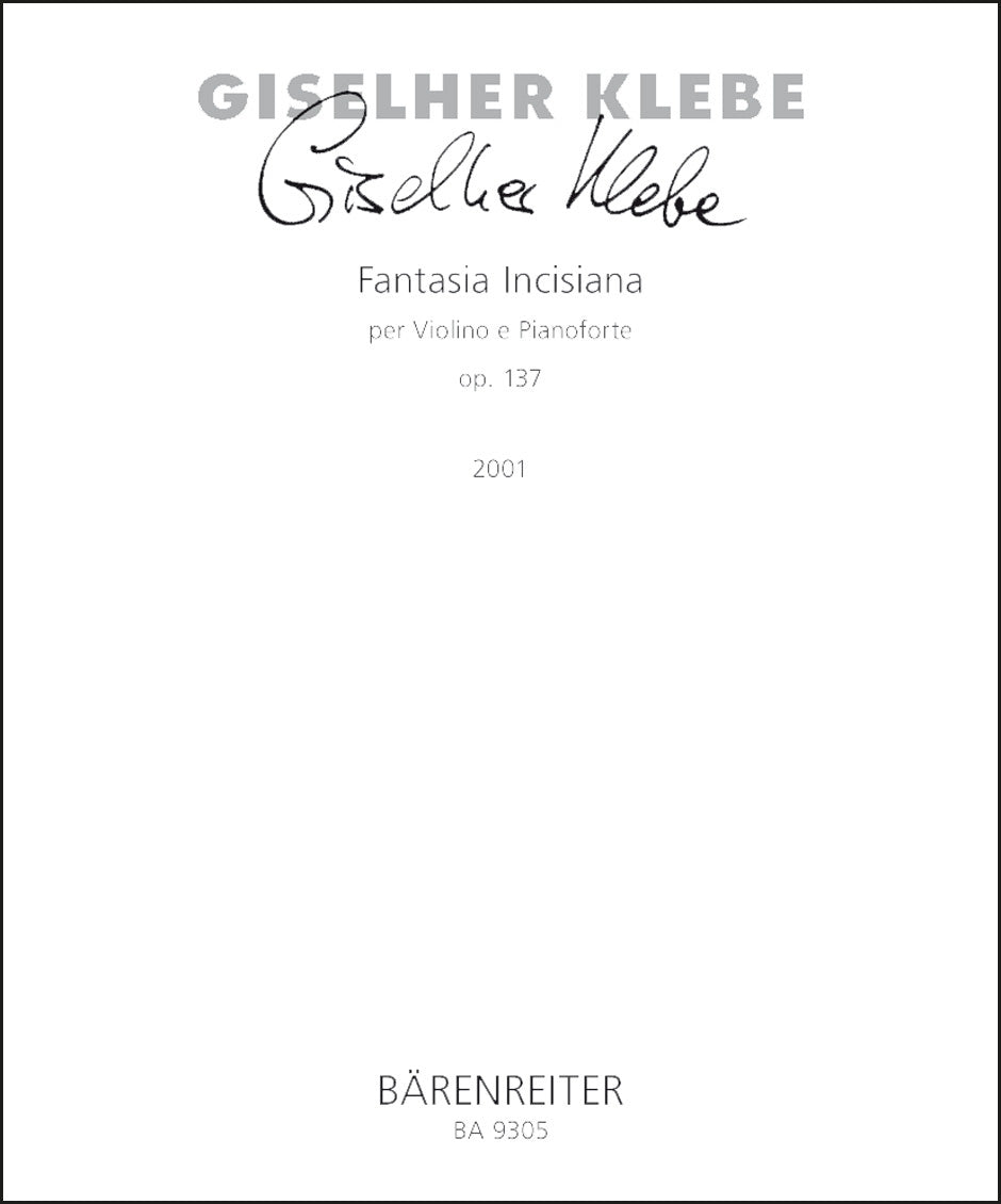 **Title**: Fantasia Incisiana per Violino e Pianoforte op. 137 (2001) | **Composer / Author**: Klebe, Giselher | **Edition Type**: Performance score, Part | **Instrumentation**: Violin, Piano | **Scoring/ Instrumentation**: Violin, Piano | **Binding**: Stapled | **Duration**: 00:18:00 | **Printing**: 3. Aufl. 2007 | **Weight**: 309.0 g | **Format**: 35,0 x 29,5 cm | **Pages**: 46/11 S. | **Language**: EN | Sample: https://data.baerenreiter.com/NB/BA/BA09305_00_9790006531011_nb_lrg_01.jpg