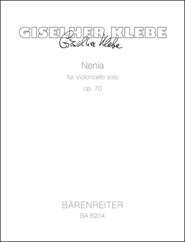 **Title**: Nenia für Violoncello solo (1974) | **Composer / Author**: Klebe, Giselher | **Edition Type**: Performance score | **Instrumentation**: Violoncello | **Scoring/ Instrumentation**: Violoncello | **Binding**: Stapled | **Level of Difficulty**: 5.0 | **Weight**: 59.0 g | **Format**: 30,1 x 23,0 cm | **Pages**: 7 S. | **Language**: EN | Sample: https://data.baerenreiter.com/NB/BA/BA06204_00_9790006476855_nb_lrg_01.jpg