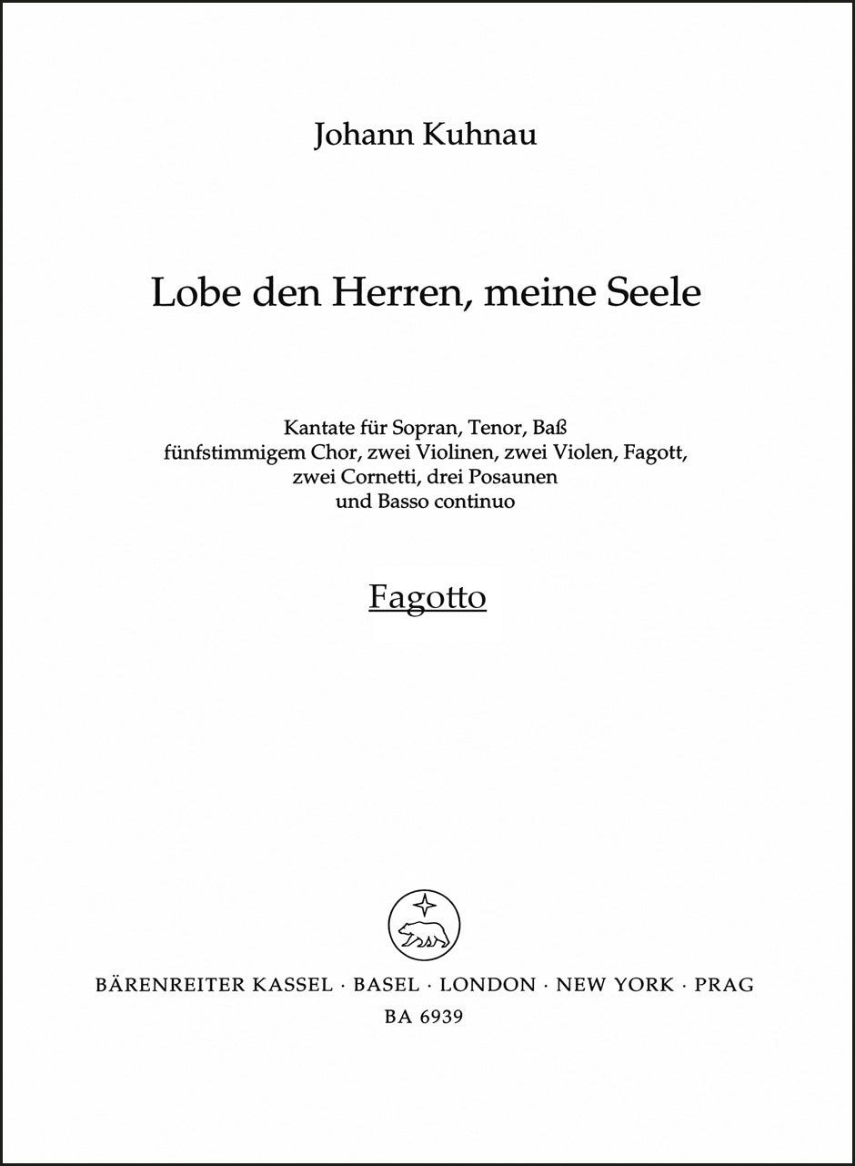 **Title**: Lobe den Herren, meine Seele | **Subtitle**: Psalm 103 | **Misc Information**: Musik der Thomaskantoren zu Leipzig | **Composer / Author**: Kuhnau, Johann | **Editor**: Rimbach, Evangeline | **Edition Type**: Part | **Scoring/ Instrumentation**: Bassoon | **Binding**: Stapled | **Weight**: 8.0 g | **Format**: 27,0 x 19,0 cm | **Pages**: 4 S. | **Language**: EN | Sample: https://data.baerenreiter.com/NB/BA/BA06939_43_9790006493746_nb_lrg_01.jpg