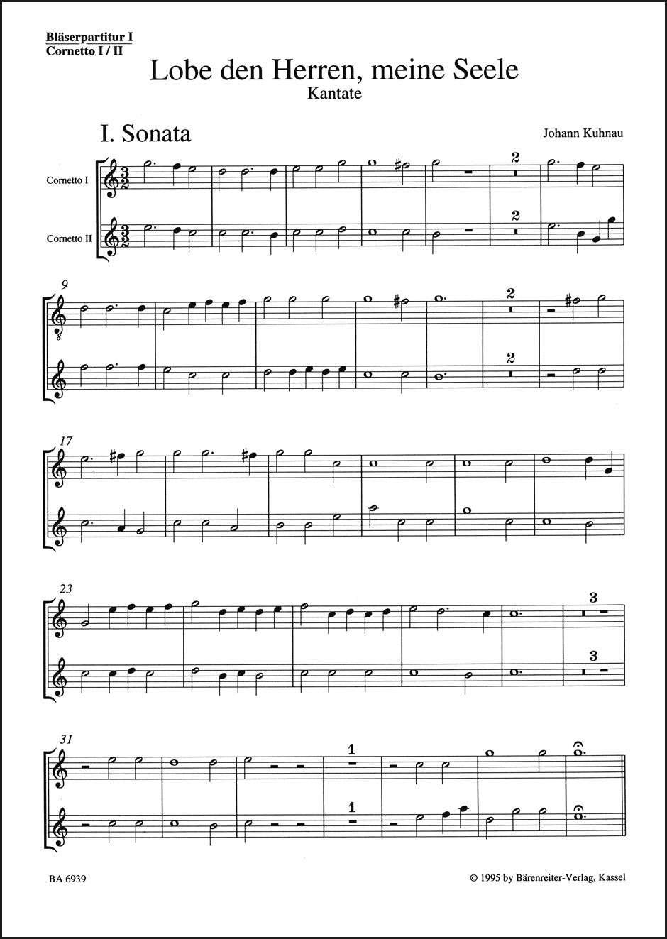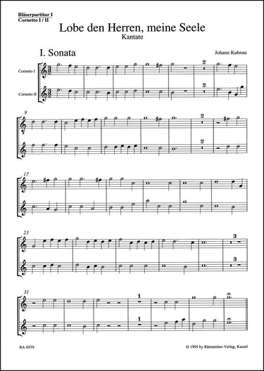 **Title**: Lobe den Herren, meine Seele | **Subtitle**: Psalm 103 | **Misc Information**: Musik der Thomaskantoren zu Leipzig | **Composer / Author**: Kuhnau, Johann | **Editor**: Rimbach, Evangeline | **Edition Type**: Wind instruments score | **Scoring/ Instrumentation**: Trumpets (2), Cornetti | **Binding**: Stapled | **Weight**: 8.0 g | **Format**: 27,0 x 19,0 cm | **Pages**: 4 S. | **Language**: EN | Sample: https://data.baerenreiter.com/NB/BA/BA06939_51_9790006493753_nb_lrg_01.jpg