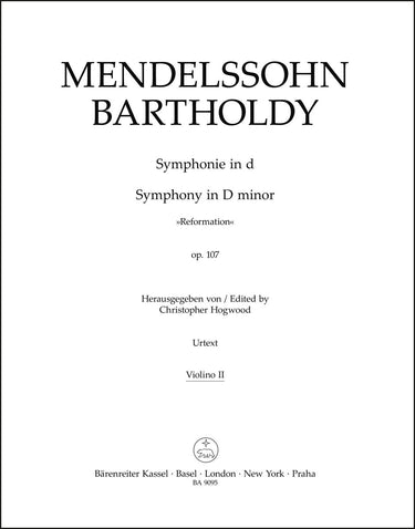 **Title**: Symphonie d-Moll op. 107 "Reformations-Symphonie" | **Composer / Author**: Mendelssohn Bartholdy, Felix | **Editor**: Hogwood, Christopher | **Edition Type**: Part, Urtext edition | **Scoring/ Instrumentation**: 2. Violin | **Binding**: Stapled | **Weight**: 67.0 g | **Format**: 32,5 x 25,5 cm | **Pages**: 15 S. | **Language**: EN | Sample: https://data.baerenreiter.com/NB/BA/BA09095_75_9790006535316_nb_lrg_01.jpg