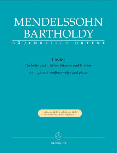**Title**: Lieder | **Subtitle**: for high and medium voice and piano | **Composer / Author**: Mendelssohn Bartholdy, Felix | **Editor**: Asti, Eugene | **Edition Type**: Singing Score, Anthology, Urtext edition | **Scoring/ Instrumentation**: High voice, Medium voice, Piano | **Binding**: Paperback | **Printing**: 1st printing 2008 | **Weight**: 793.0 g | **Format**: 30,0 x 23,0 cm | **Pages**: LXXX, 154 S. | **Language**: EN | Sample: https://data.baerenreiter.com/NB/BA/BA09085_00_9790006536078_nb_lrg_01.jpg