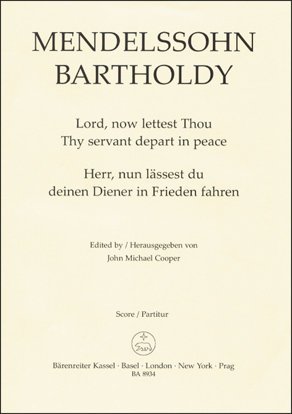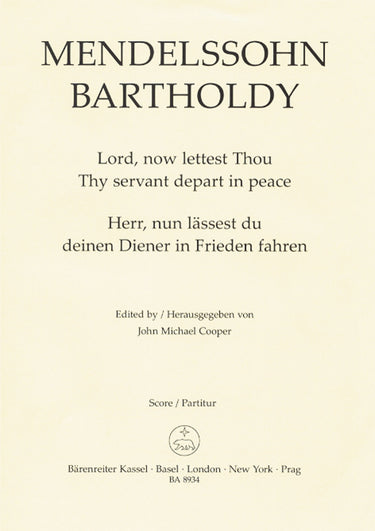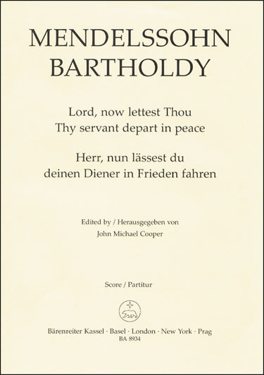 **Title**: Lord now lettest Thou Thy servant depart in peace op. 69 | **Composer / Author**: Mendelssohn Bartholdy, Felix | **Editor**: Cooper, John Michael | **Edition Type**: Choral score, Urtext edition | **Instrumentation**: Choir, Organ | **Scoring/ Instrumentation**: Mixed choir (SATB), Organ ad libitum | **Binding**: Stapled | **Level of Difficulty**: 3.0 | **Printing**: 1st printing 2006 | **Weight**: 28.0 g | **Format**: 27,0 x 19,0 cm | **Pages**: 11 S. | **Language**: EN | Sample: https://data.baerenreiter.com/NB/BA/BA08934_00_9790006528981_nb_lrg_01.jpg