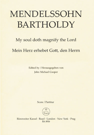**Title**: My soul doth magnify the Lord op. 69 | **Composer / Author**: Mendelssohn Bartholdy, Felix | **Editor**: Cooper, John Michael | **Edition Type**: Choral score, Urtext edition | **Instrumentation**: Choir | **Scoring/ Instrumentation**: Mixed choir (SATB) | **Binding**: Stapled | **Level of Difficulty**: 3.0 | **Printing**: 1st printing 2006 | **Weight**: 64.0 g | **Format**: 27,0 x 19,0 cm | **Pages**: 27 S. | **Language**: EN | Sample: https://data.baerenreiter.com/NB/BA/BA08936_00_9790006529001_nb_lrg_01.jpg