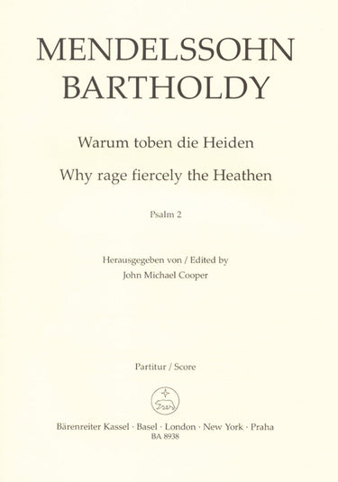 **Title**: Why rage fiercely the Heathen op. 78 | **Misc Information**: Psalm No. 2 | **Composer / Author**: Mendelssohn Bartholdy, Felix | **Editor**: Cooper, John Michael | **Edition Type**: Choral score, Urtext edition | **Instrumentation**: Choir | **Scoring/ Instrumentation**: Mixed choir: SSAATTBB | **Binding**: Stapled | **Level of Difficulty**: 3.0 | **Printing**: 1st printing 2007 | **Weight**: 119.0 g | **Format**: 27,0 x 19,0 cm | **Pages**: 50 S. | **Language**: EN | Sample: https://data.baerenreiter.com/NB/BA/BA08938_00_9790006529025_nb_lrg_01.jpg