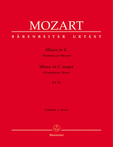 **Title**: Missa in C major K. 66 "Dominicus Mass" | **Composer / Author**: Mozart, Wolfgang Amadeus | **Editor**: Senn, Walter | **Edition Type**: Score, Urtext edition | **Scoring/ Instrumentation**: Vocal, Mixed choir, Orchestra | **Binding**: Paperback | **Level of Difficulty**: 3.0 | **Duration**: 00:43:00 | **Weight**: 366.0 g | **Format**: 30,0 x 22,8 cm | **Pages**: V, 100 S. | **Language**: EN | Sample: https://data.baerenreiter.com/NB/BA/BA04791_00_9790006456789_nb_lrg_01.jpg